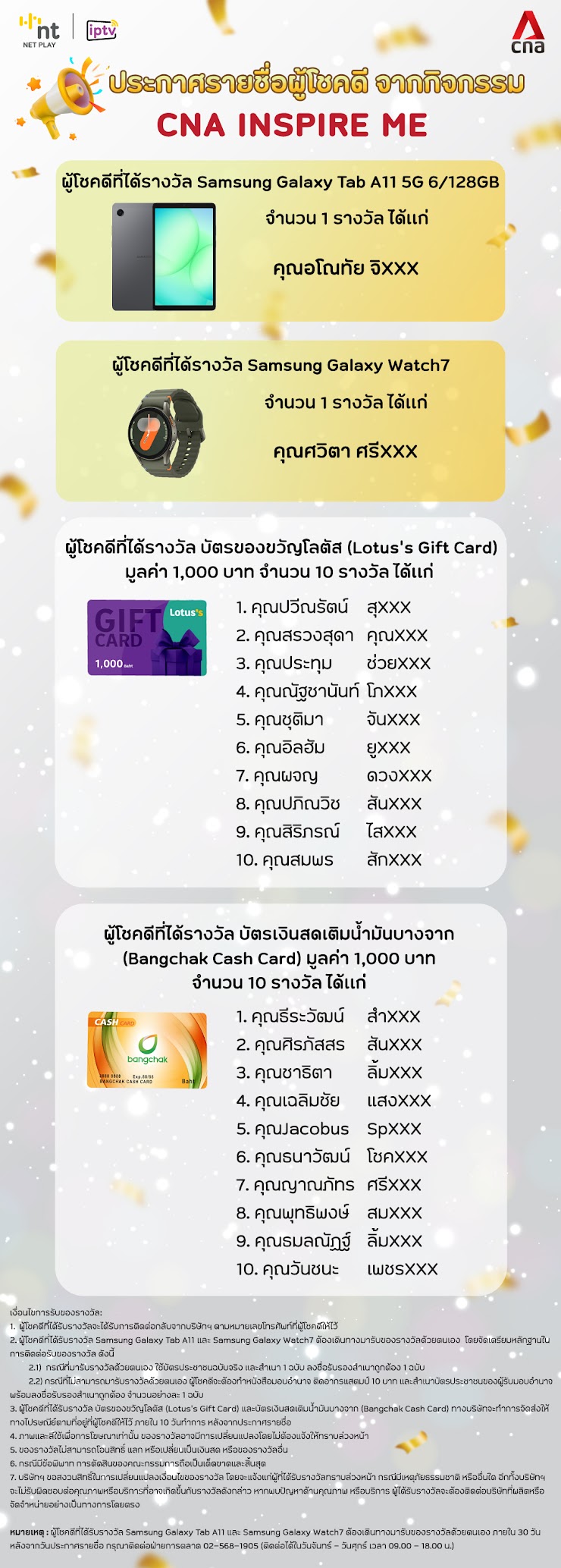 ผู้โชคดีจากกิจกรรม NT NET PLAY | iptv x CNA CAMPAIGN 2026 (CNA INSPIRE ME)